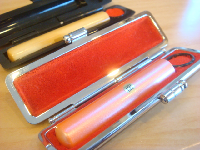 さて、先ほど 完成した柘材カラーはんこ(パールカラーシリーズ)を取に女性の方がご来店になりました。